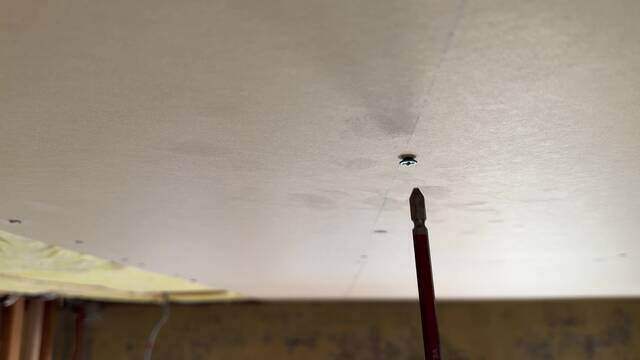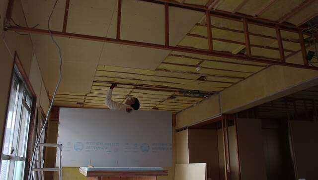 既存の天井下地を活かしているので微妙にサイズ合わせが必要、 石膏ボードを上げたり下げたりするのでかなり疲れます。