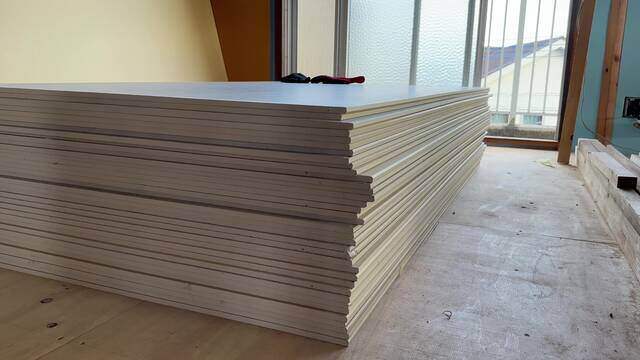 9.5mmの石膏ボードを36枚、12.5mmの石膏ボードを20枚荷上げしました。