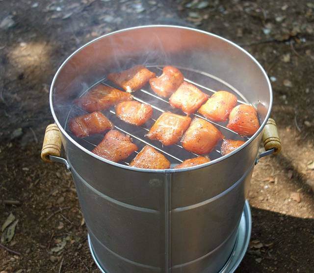 燻製器を火にかけ、チップから煙が立ち上ってきたら、その上に食材を置いた網を乗せて燻していきます。網にあらかじめ油を吹きかけておくと、食材が網にこびりつきにくくなるのでオススメです。また、食材は事前に陰干ししておくと、水分が飛んで身崩れしにくくなると同時に香りが付きやすくなり、仕上がりの色や歯ごたえもよくなりますよ!