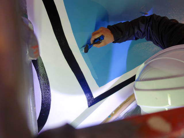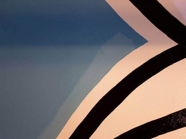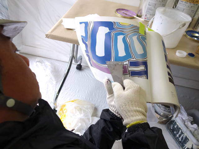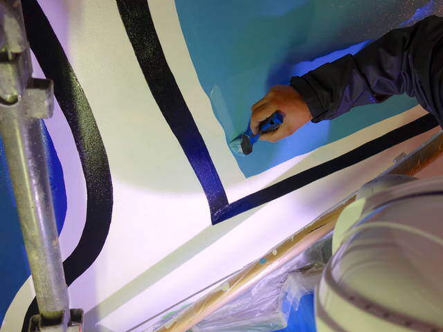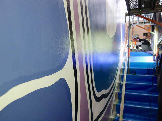 調色エリアの横では、塗装作業が進行。「今日はいつもの現場と違うな〜」と言いつつも、スムーズに刷毛を滑らせ描かれるその線に迷いがありません。作品自体が直線的というよりも有機的な線で描かれているため、湾曲部分の角度や幅、線のエッジの取り方などコントロールが繊細なのは、この世に1点しか存在しない「作品」の再現ならでは。作業の途中、「やっぱり実物の作品を見て、線の引き方や雰囲気を確認したい」とのリクエストもあり、急遽作品倉庫から佐々木氏の作品を運び出し筆のタッチを確認する場面も。