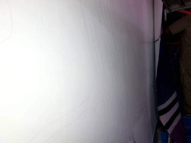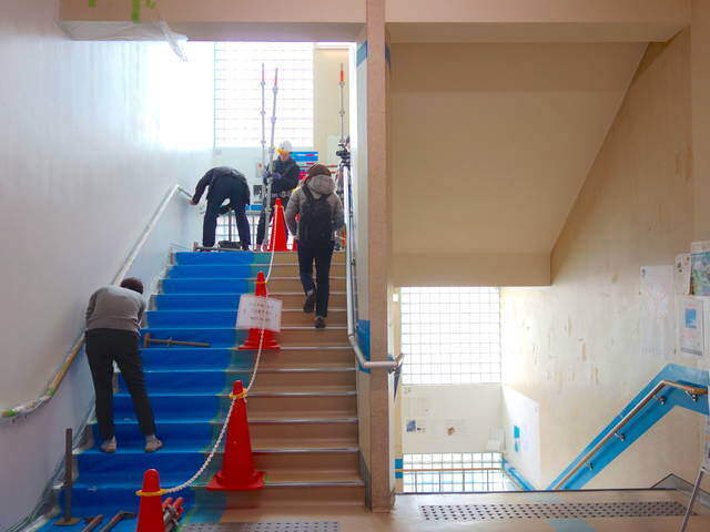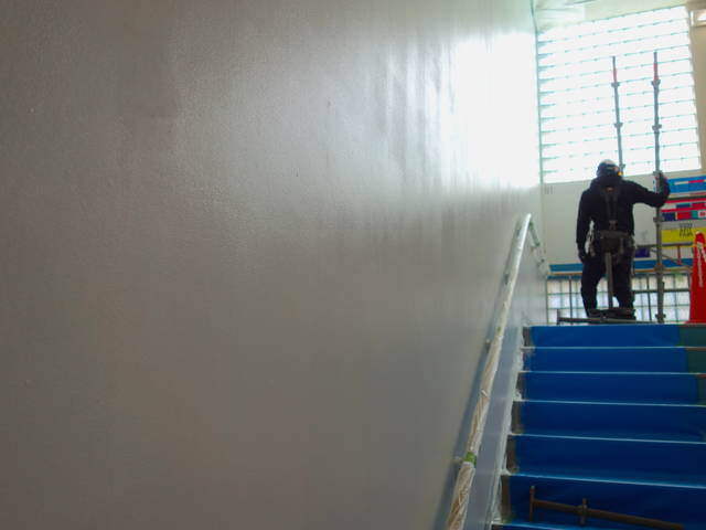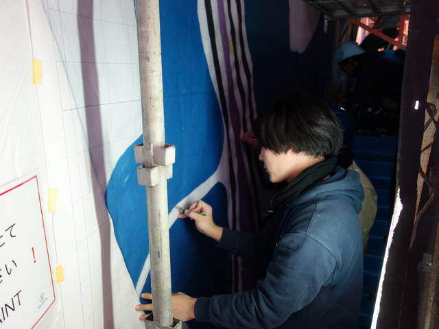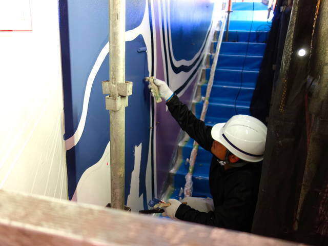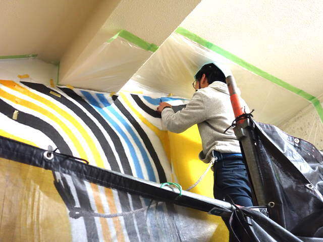 壁画を制作するのは、1階から2階にかけた階段の壁2面。それぞれサイズは高さ約3.6m× 横幅7m。まずは、キャンバスとなる壁面の汚れや凹凸をなくし、下地を塗っていきます。