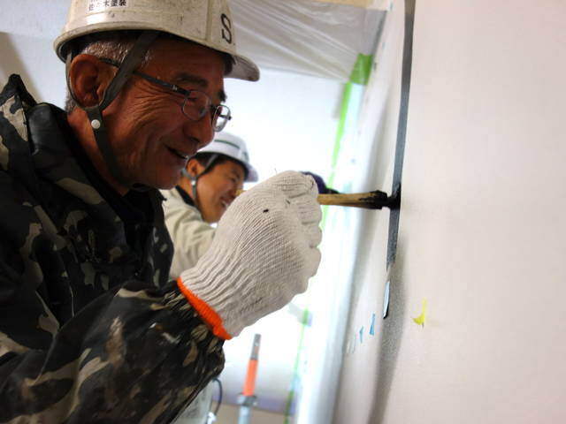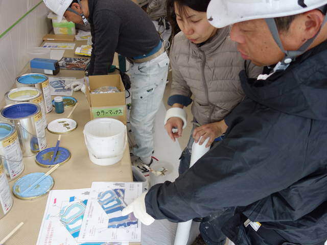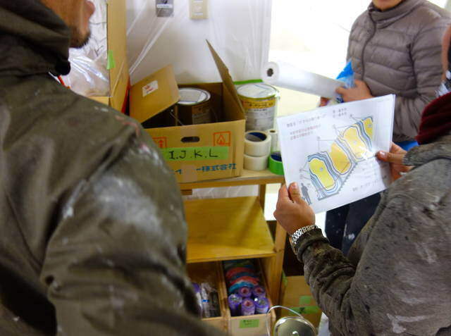 早速、プランを手に取り、作業の順番や調色、塗り面の確認などを行っていきます。今回使用する塗料は、このプロジェクトに協賛する日本ペイント株式会社による室内環境配慮形水性つや有り塗料「オーデコートGエコ」。有害物質を極力控えた、室内でも臭いがほとんど気にならない商品で、公共施設などでも多く用いられるものだそう。
