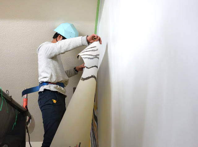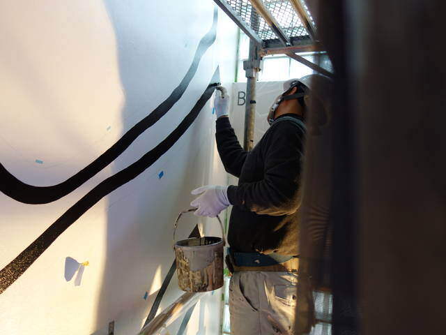 裏塗りが完了したら、ロール紙を壁面にあて、ずれないように慎重に貼り合わせていきます。そして、今度は表面からアウトラインをなぞることで、裏面に描いた線が壁面に写る仕組み。
