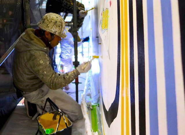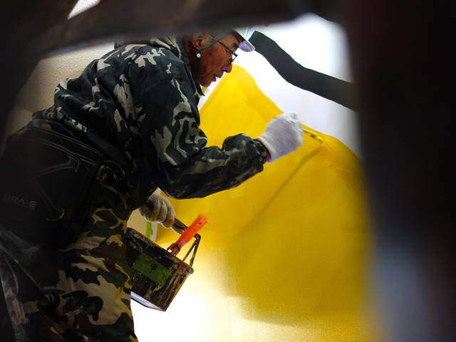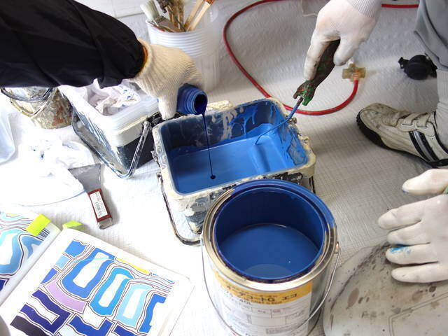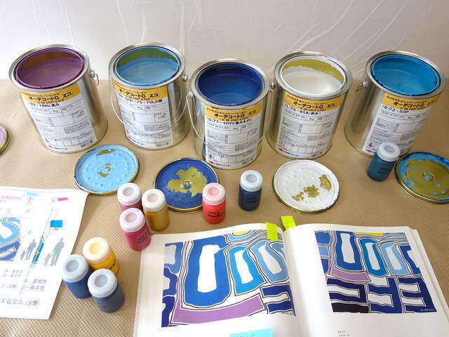 塗装作業に入る前に、まずは塗料の色を確認。作品をできる限り忠実に再現するためにも、色の正確さは重要。基本色は事前に工場で調色し、一部の色は調色ができる職人が現場で調色。計量カップなどで数値をもとに調整するのかと思いきや...原本となる画集を見ながら、なんと経験値で測っていくから驚き!
