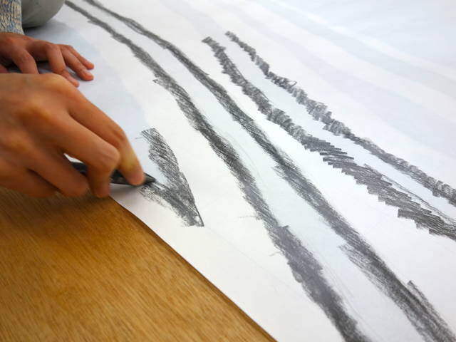 構成が決まったら、次に下絵となる原画の裏塗り作業。別の作業スペースで、協力されている東京藝術大学の学生を中心としたチームが制作されていました。1つの絵を縦に7分割し、それぞれをロール紙に出力。出力した絵を裏返して、絵のアウトラインをグラファイトクレヨンでなぞります。