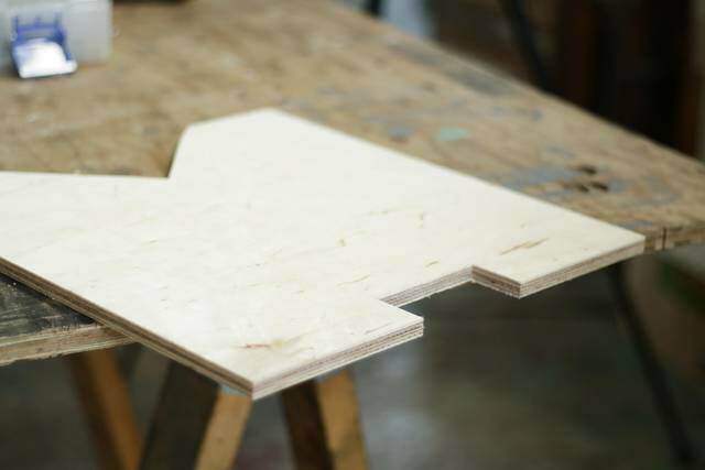 座面となる合板Aの切り出しからスタート。座面が側面板と噛み合うように、4辺すべてを凸型にカットしていきます。ここが曲がってしまったり、長さを間違えたりすると、ガタつきの原因となりますので注意しましょう。