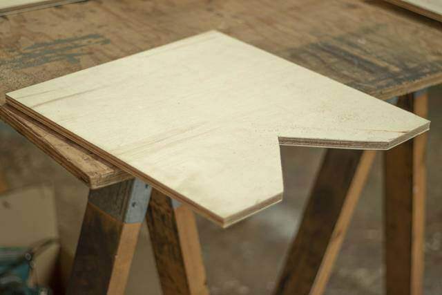 三角形を合板Bの4枚すべてに下書きしたらカット。床と設置する脚の加工が完了しました。