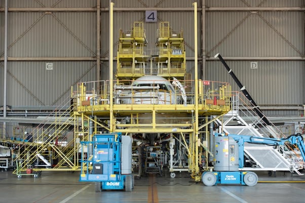周囲を見渡すと、格納庫には作業用の巨大な足場やクレーン、無数の工具類などが整然と配置されています。床には誘導ラインや作業エリアを示すマークなども引かれ、安全第一で作業が行われていることが伺えます。
