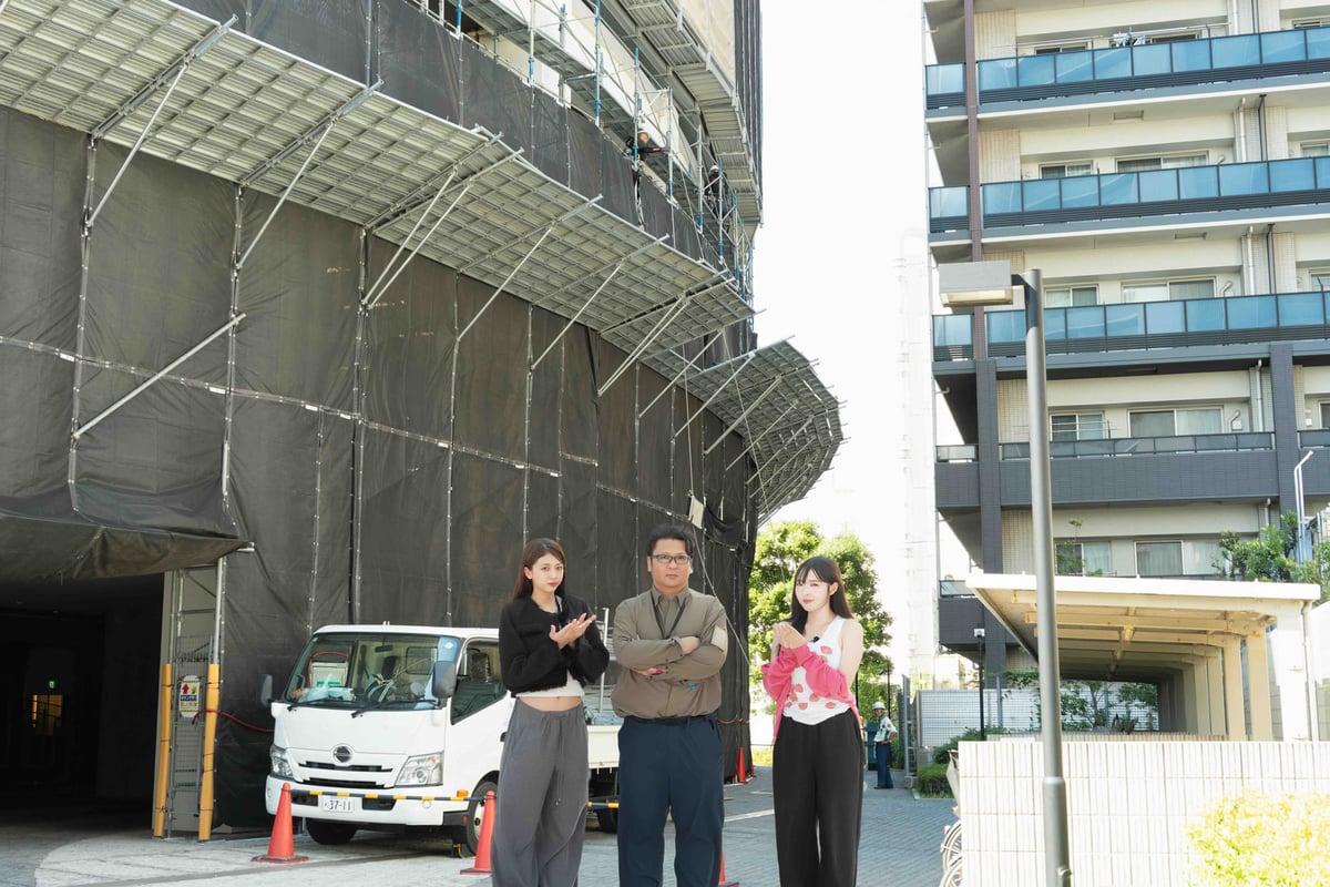 今回の記事では、普段なかなか立ち入ることのできない「タワーマンションの大規模修繕」という現場での収録の様子と、実際の修繕工事の内容をレポートします。迫力満点の工事現場に、しゅうさん、ひわさんの反応はいかに!?