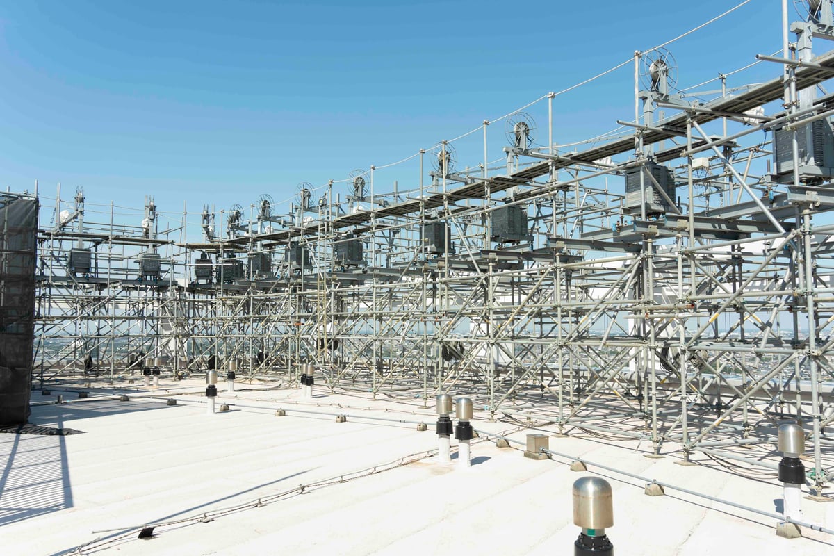 屋上の端には、建物の周囲をぐるりと囲むように2層式連結ゴンドラを動かすための装置が設置されています。鉄パイプの足場と無数の滑車が屋上の全周に渡って組まれており、この滑車付きレールに沿ってゴンドラを上下させる仕組みです。