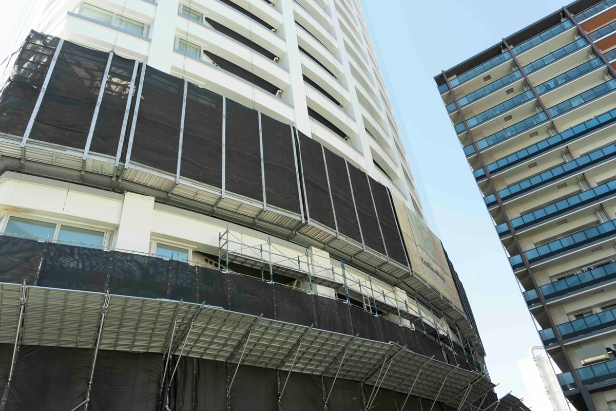 工事は千葉県船橋市内でひときわ高くそびえる38F建てのタワーマンションで行われており、高さ約130mもの建物を真下から見上げると、その圧倒的なスケールに思わず息を呑みます。