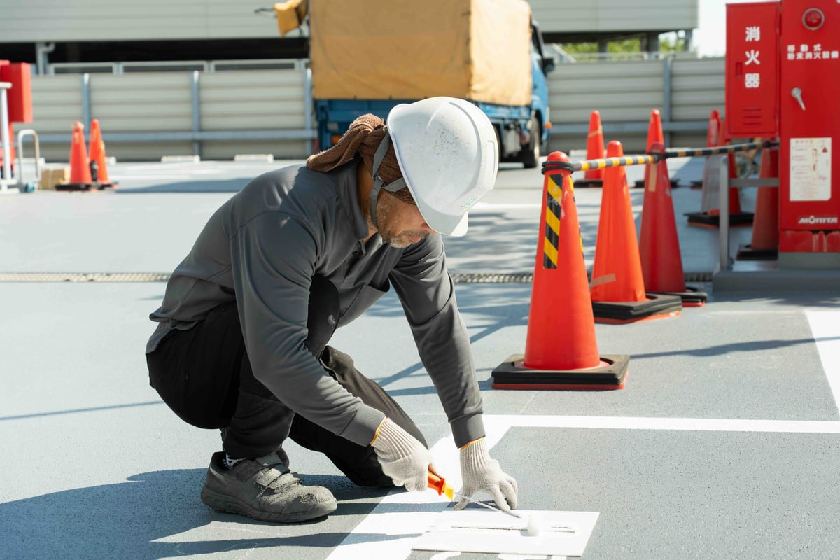 実はこのマンションの大規模修繕工事では、建物の外壁や屋上だけでなく、敷地内の附帯設備の補修も行われます。今回は駐車場に描かれた白線や区画番号の塗り直し作業の真っ最中とのことで、職人さんたちの作業現場を特別に見学させていただきました。
